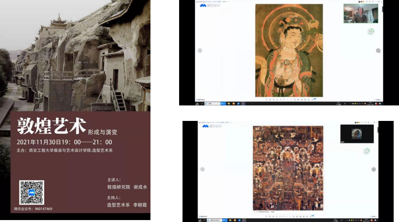 造型艺术系于2021年11月30日晚7点在腾讯会议召开美术学专业导师团活动。此活动特邀敦煌研究院著名学者、画家谢成水老师在线讲授《敦煌艺术形成与演变》的专题讲座。会议由服装学院造型艺术系副主任李朝霞副教授主持,美术学专业2018级、2019级、2020级三届近300名学生及多位专业教师共同参与学习。