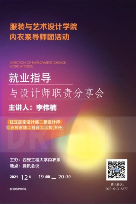 为落实导师团三全育人体制机制建设,推进内衣工程系就业指导,培养学生设计思维理念,实现导师团育人效力。服装与艺术学院内衣工程系于12月6日在腾讯会议召开内衣工程专业就业指导与设计师职责导师团分享会。此次会议特邀我校优秀毕业生红豆居家设计部主任李伟楠主讲,会议由内衣系主任周捷教授主持,内衣系教师及全体内衣系本科生一百余人参加会议。