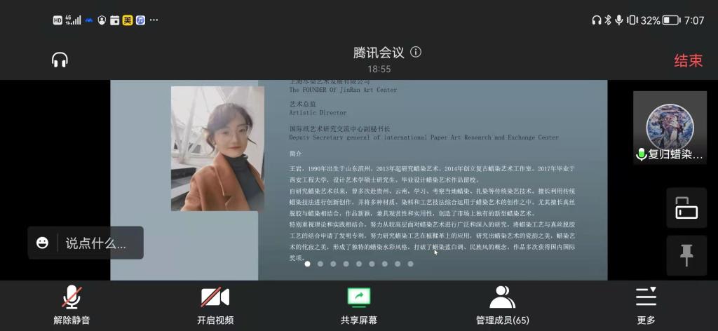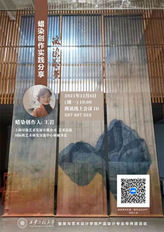 产品设计系于12月6号晚19:00在腾讯会议召开产品设计专业导师团活动。此活动特邀我校优秀毕业生、蜡染创作人王岩老师为产品设计专业全体师生进行《蜡染创作实践分享》的主旨讲座,会议由产品设计系王燕老师主持,产品设计系教师及本科生一百余人参加会议。
