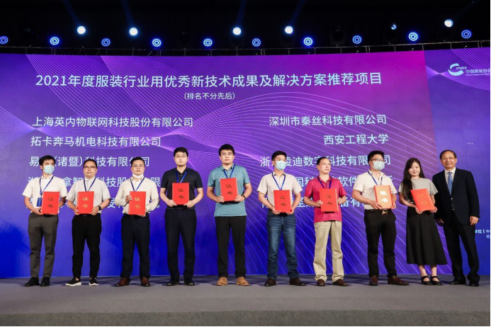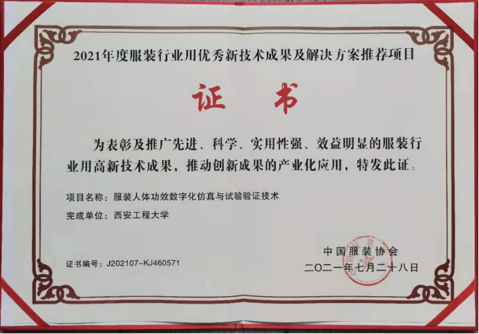 大会颁发了2021年中国服装行业科技进步奖、2021年度中国服装行业用优秀技术成果及解决方案推荐目录、2021年中国服装行业优秀专利、2021年中国服装行业技术创新示范企业等奖项。其中我校 “四主体一联合” 陕西省服装智能设计与制造工程技术研究中心技术的科研成果“服装人体工效数字化仿真与实验验证技术”获得2021年度中国服装行业用优秀技术成果及解决方案推荐项目。吴龙副教授受邀参加此次会议并代表工程技术研究中心领取证书。