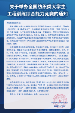 根据《教育部关于开展国家虚拟仿真实验教学项目建设工作的通知》(教高函〔2018〕5号)和《教育部关于一流本科课程建设的实施意见》(教高函〔2019〕8号)的有关要求,为了推动纺织服装虚拟仿真一流课程建设,实现纺织服装虚拟仿真实验教学项目建设与应用体系化、标准化、装备化,探索实验课程建设与应用机制创新,为全国大学生工程训练综合能力竞赛2022年度竞赛项目遴选申报做准备,经研究决定于2021年5-6月举办第一届全国纺织类大学生工程训练综合能力(虚拟仿真)竞赛。