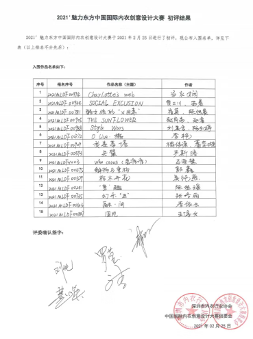 2020年2月25日,2021’魅力东方中国·国际内衣创意设计大赛初评在深圳评选完毕。在公平、公正、公开的原则下,经过专家评审团的层层筛选,15幅作品最终脱颖而出,入围本届大赛的总决赛。