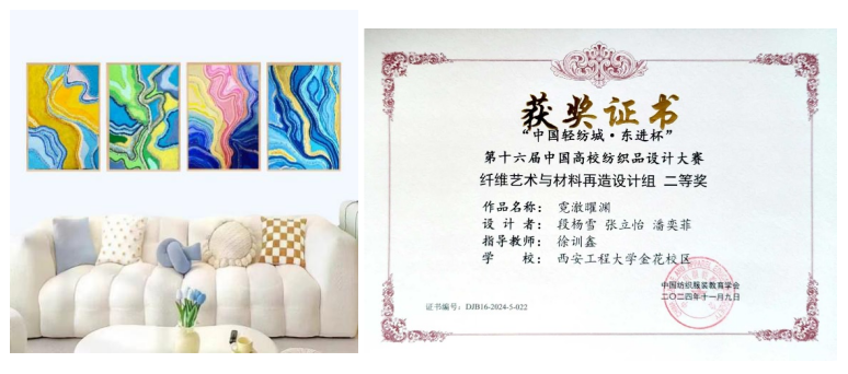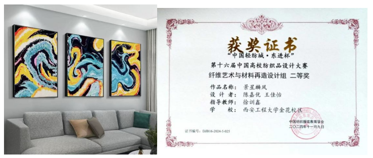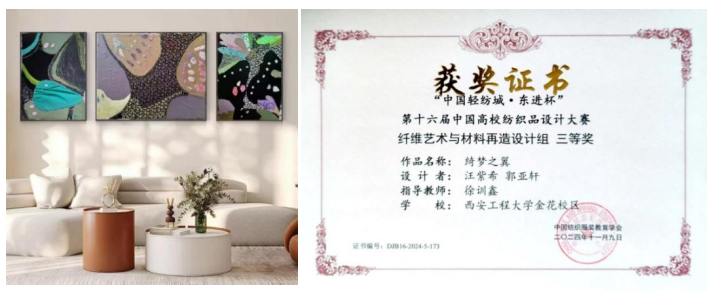 这些凝聚着师生智慧与汗水的作品,在第十届“巧兴杯”中国拼布创意设计大赛和第十六届中国高校纺织品设计大赛中崭露头角。凭借着独特的创意视角、扎实的专业功底和出色的动手能力,我校师生团队在大赛中斩获佳绩。在第十届“巧兴杯”中国拼布设计大赛中荣获优秀奖1项,在“东进杯”中国大学生纺织品设计大赛中更是表现卓越,荣获一等奖1项、二等奖2项、三等奖3项。这些成绩不仅是对学生个人专业素养的高度肯定,更是我校教学成果的有力见证。