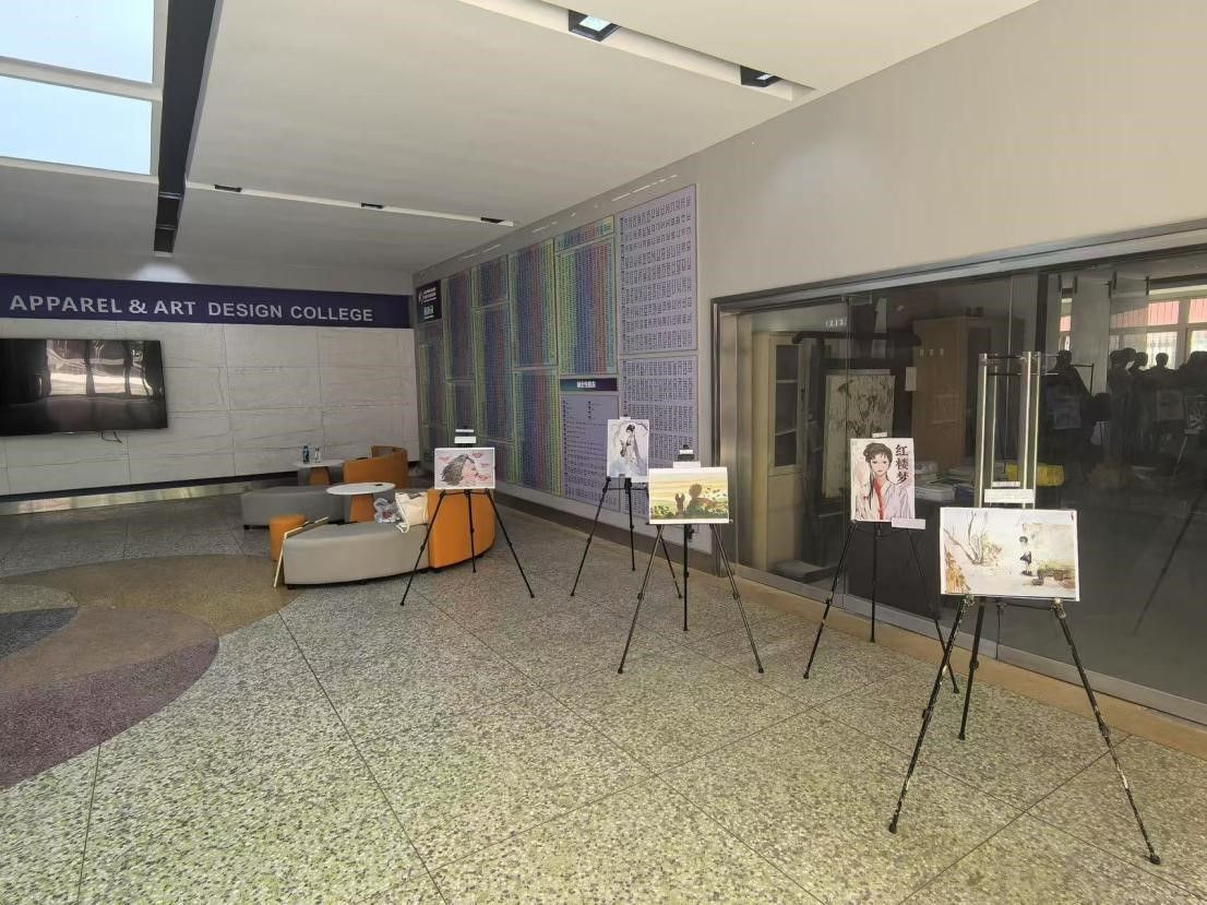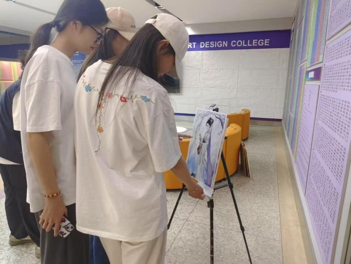 经过从创意性、技术表现及与文本契合度等维度进行评审,共有13幅作品入围,成为优秀展出作品。柯莉同学的《云边有个小卖部》将山峦叠嶂的云边镇设计成云朵隐喻,透过层叠的树木与晨光,我们仿佛看到了刘十三的梦想;刘仕阳同学画的《封神演义》中的哪吒采用中国传统工笔画风格,以四种形象呈现出他复杂多面的性格,营造出热烈而奇幻的神话氛围;布雅洁同学的《红楼梦》通过创意融合了黛玉和宝钗的形象,暗示了两位女子交织的命运,展现出古典人物的神韵;孙益璇同学的《人生苦旅—道士塔》以失衡的构图凸显被掠走文物数量的惊人,用浓重的红色渲染出民族伤痛的鲜活血痕,让人仿佛感受到了历史吐出的重重叹息……这些优秀作品吸引了师生们驻足欣赏。