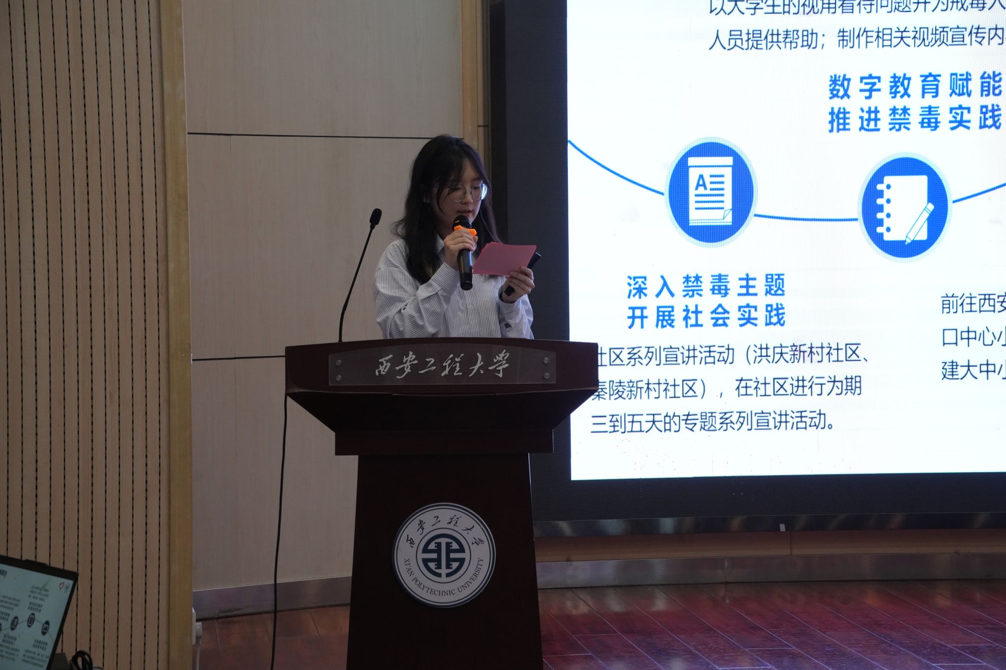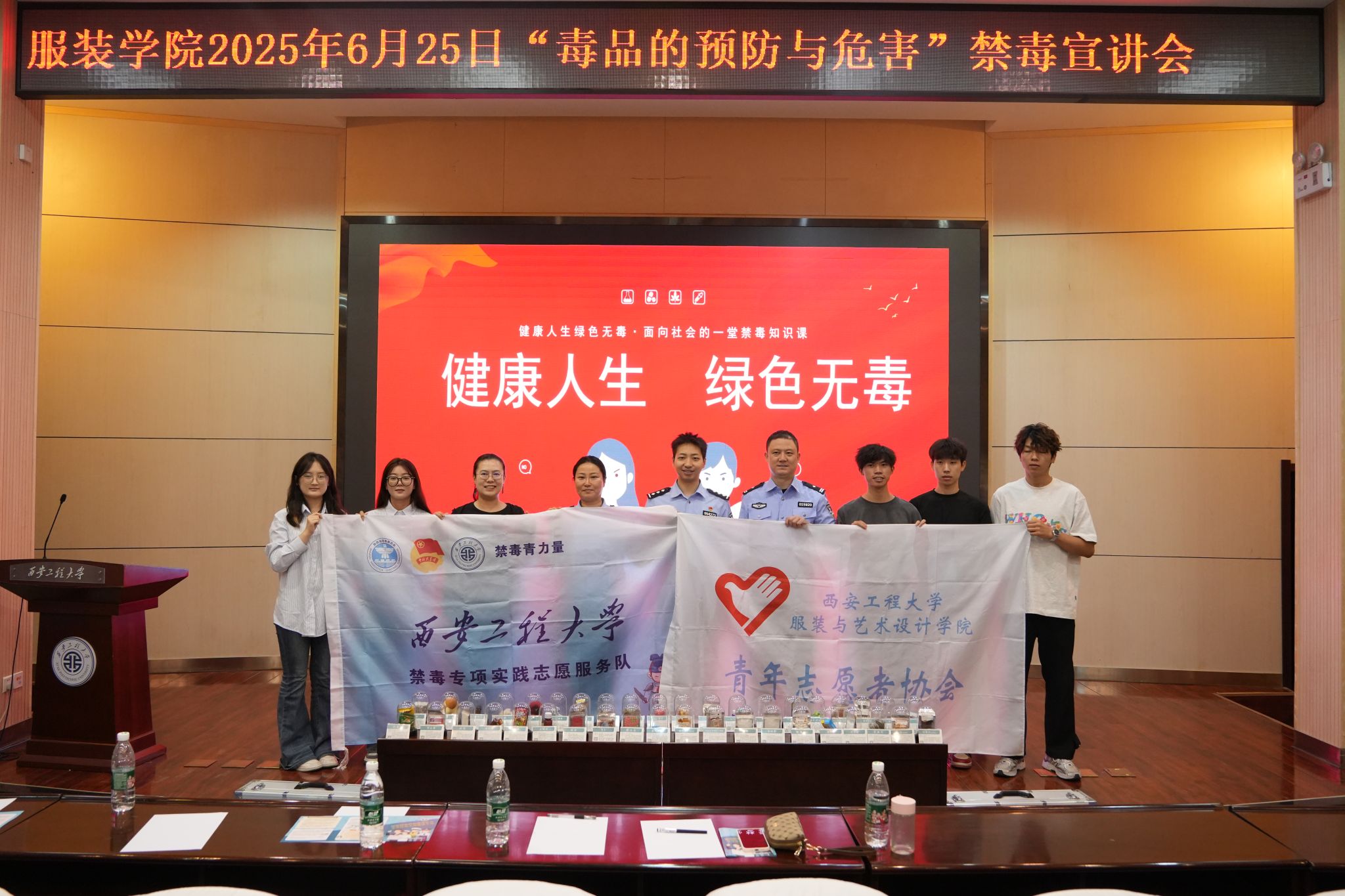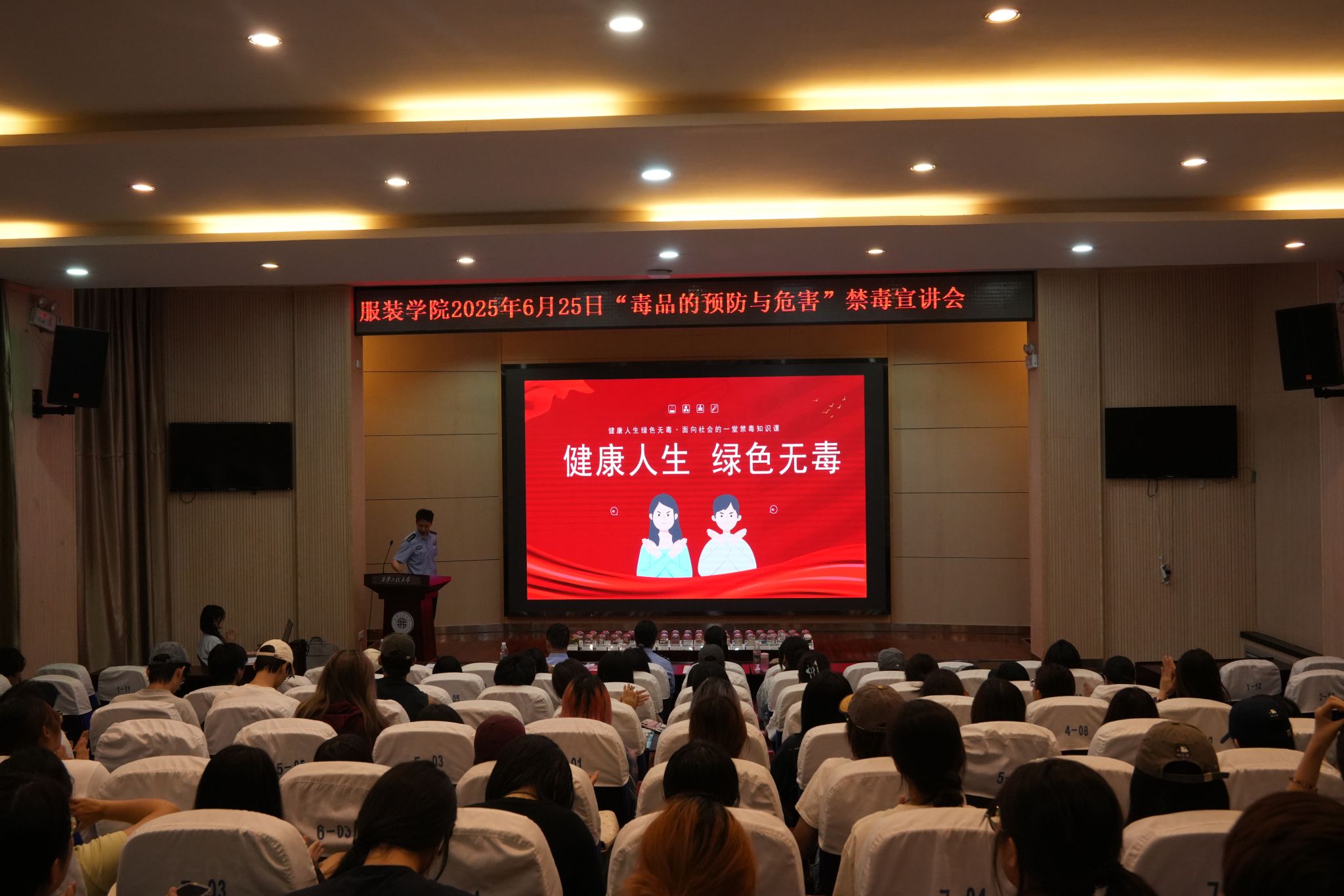 在第38个国际禁毒日来临之际,为进一步提升广大师生识毒、防毒、拒毒意识和能力,6月25日下午,首场系列活动——“健康人生,绿色无毒”专题宣讲会在金花校区西纺报告厅成功举办。西安市碑林区禁毒大队教育宣传一级警长高歌、碑林区禁毒委员会办公室毒品危害与防治专职讲师王豪、韩杰及服装学院团委副书记孙晨倩参加活动。