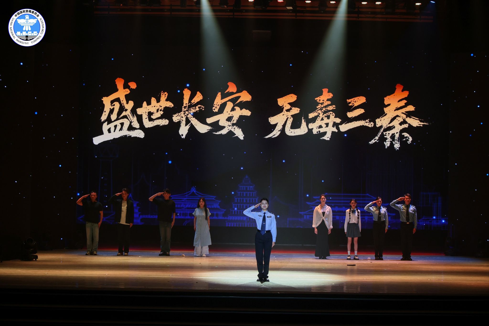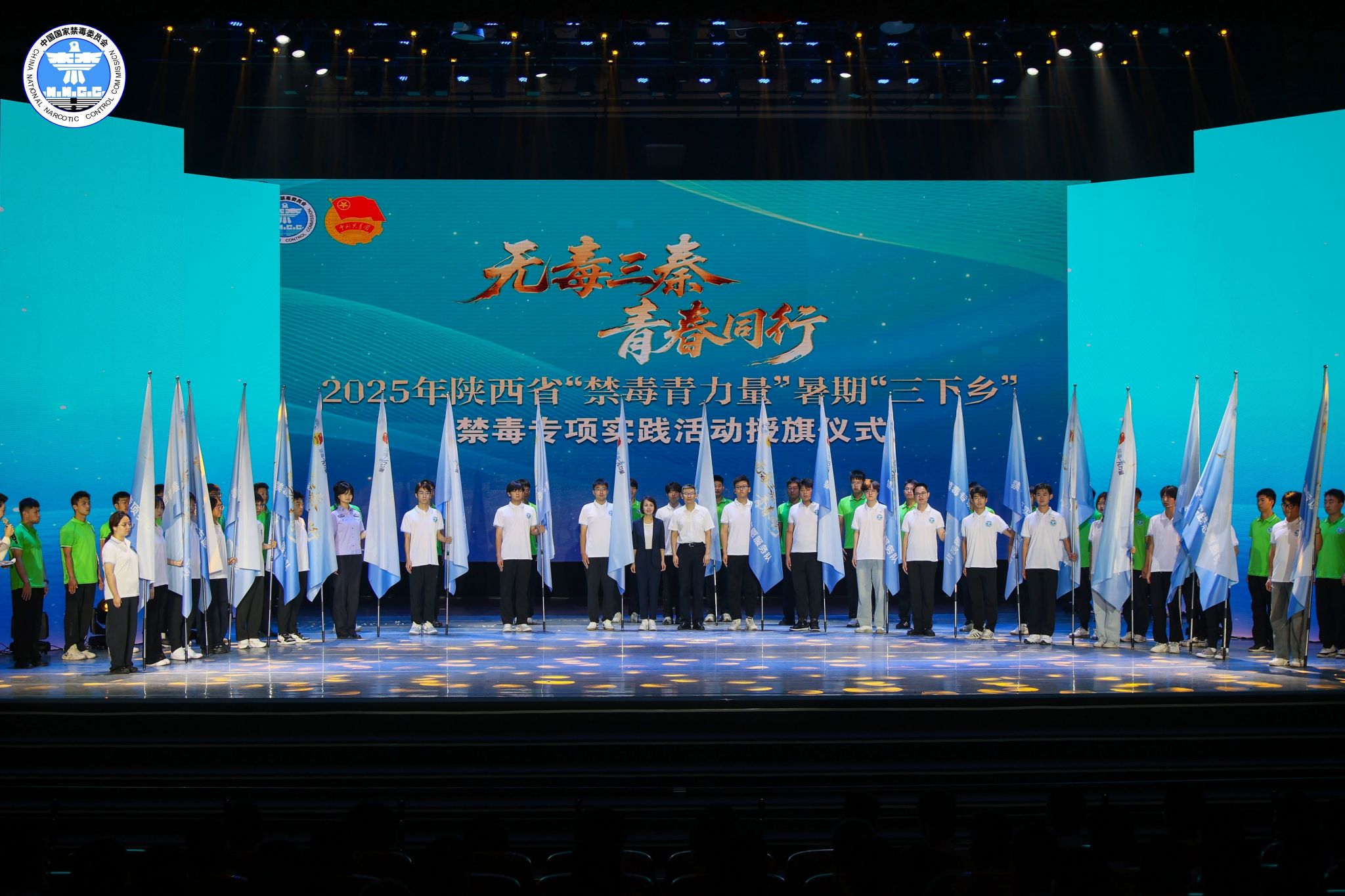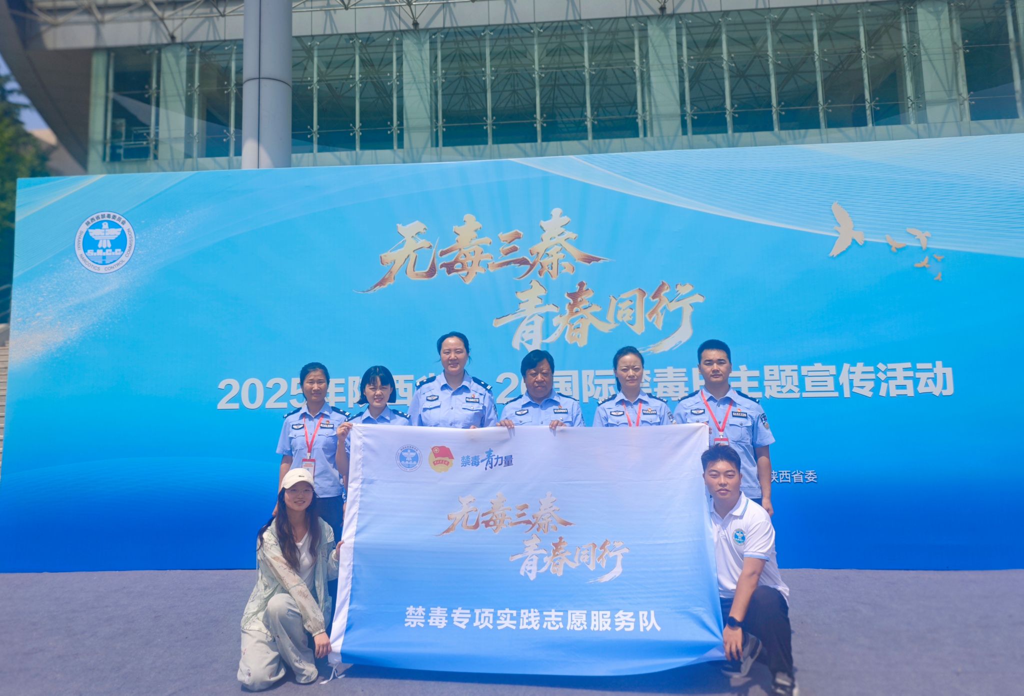 6月26日,服装学院“‘毒’行睘睘”实践队学生代表前往陕西师范大学,参加了由陕西省禁毒委员会等单位联合主办的 “无毒三秦、青春同行”2025年陕西省6.26国际禁毒日主题宣传活动。活动采用了沉浸式体验的形式,通过《守护长安》光影剧、《破碎的方程式》情景剧等新颖别致的艺术表演,生动深刻地传递了珍爱生命、远离毒品的理念。现场举行了庄严的禁毒志愿服务队授旗仪式,标志着全省大学生暑期“三下乡”禁毒宣传实践活动正式拉开帷幕。活动最后,全体参会师生合影留念。