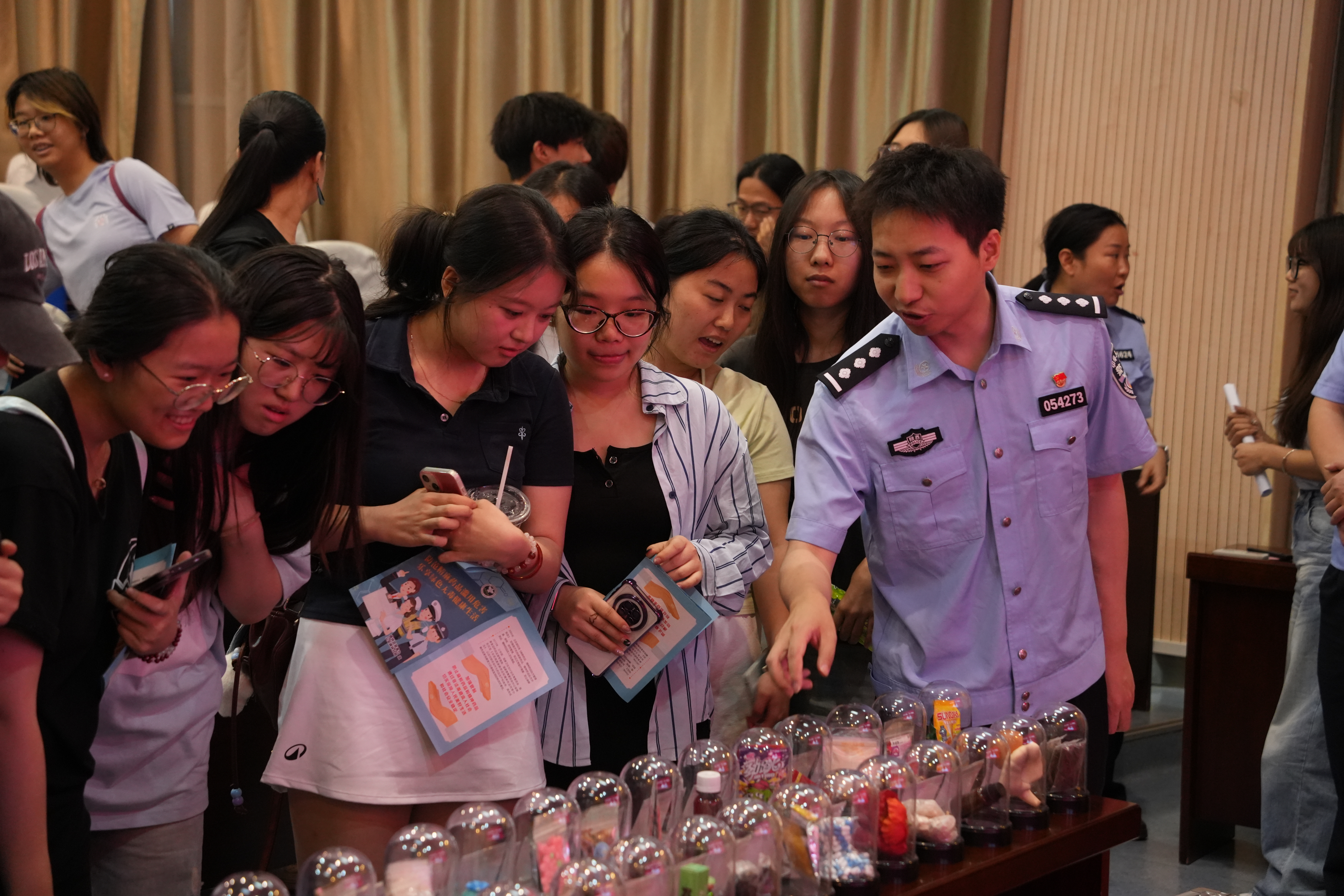宣讲会上,王豪警官作了主题宣讲报告。他结合近期侦破的真实案例,生动详实地剖析了新型毒品的种类、伪装形态、巨大危害以及滥用后果,为在场师生敲响了深刻的警钟,现场反响热烈。随后,学院禁毒实践团队成员代表登台,向与会师生简要介绍了团队在过去四年持续推进禁毒宣传工作的成果积累与实践经验。同时,会场特别设置了仿真毒品模型展示区。在警官们的专业讲解下,师生们近距离、清晰地观察了各类毒品及新型伪装毒品的仿真模型,“零距离”接触加深了对毒品外观特征的认识。整个展示与互动环节有效提高了大家的识别能力和防范意识。