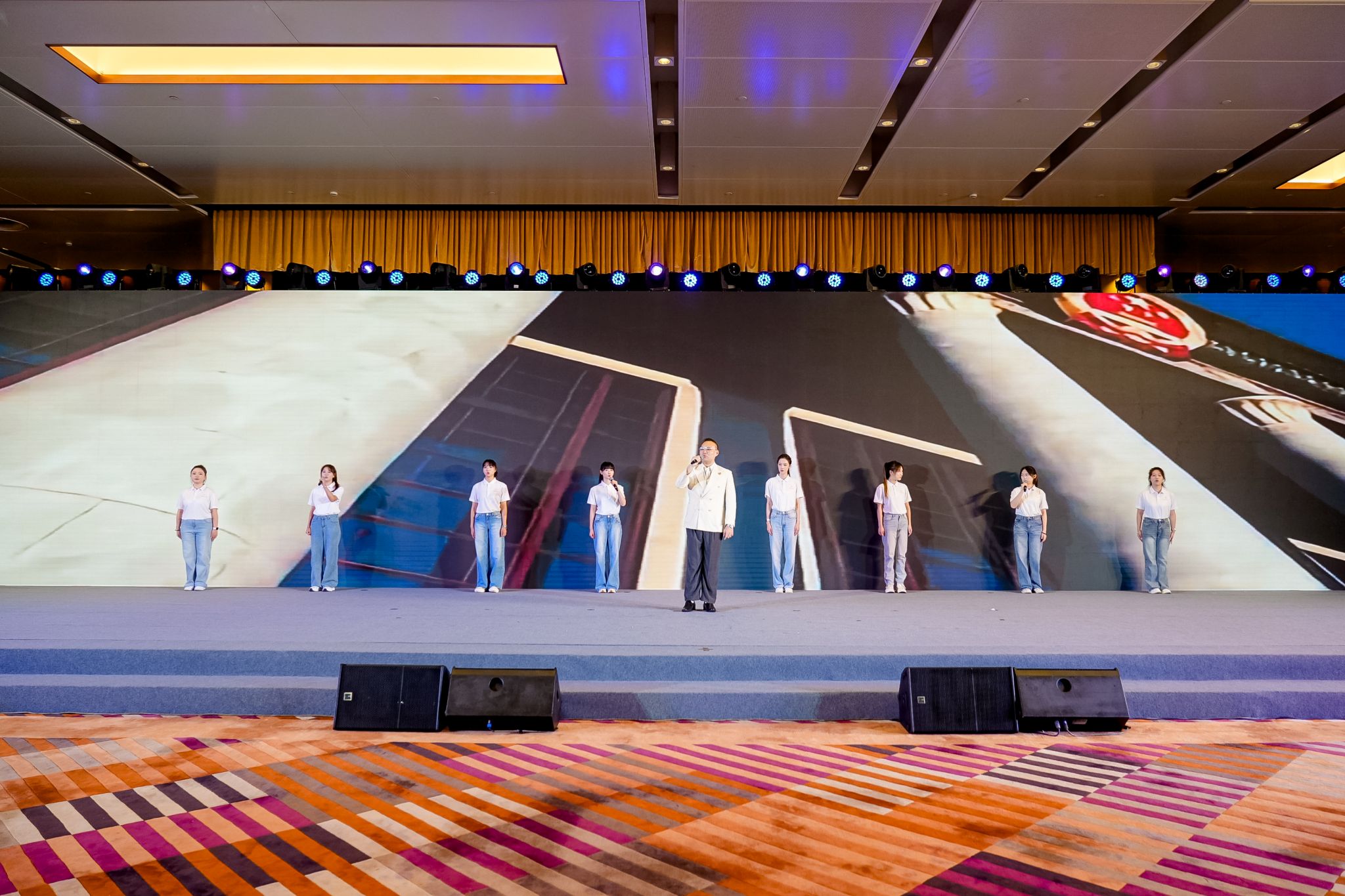 开幕式上,陕台青年通过舞蹈、民乐等形式展现文化交融。作为压轴节目,台湾青年陶泓宇与服装学院学子共同献唱《我和我的祖国》,激昂歌声点燃全场,传递两岸同胞对祖国的深情祝福。演出结束后,省台办张洁亲切慰问参演学生,高度评价其表现,并希望同学们用专业素养和青春热情架起了文化沟通的桥梁。