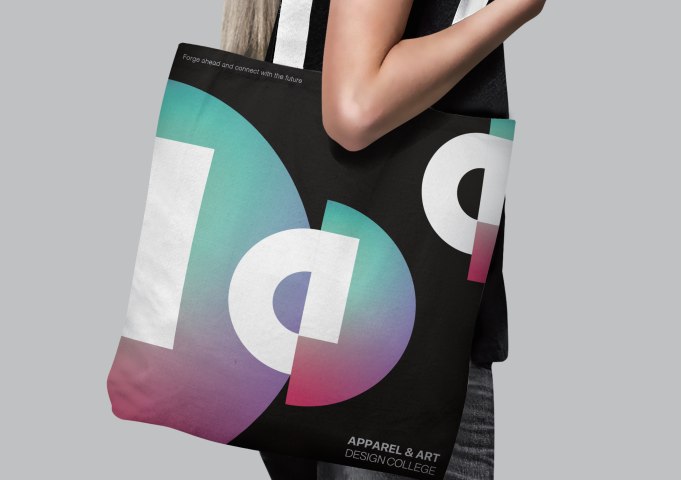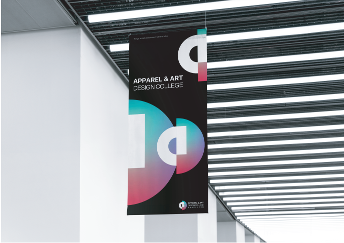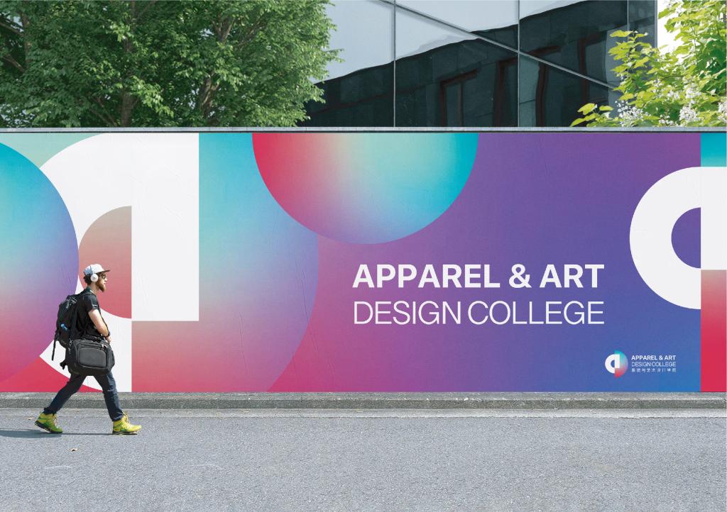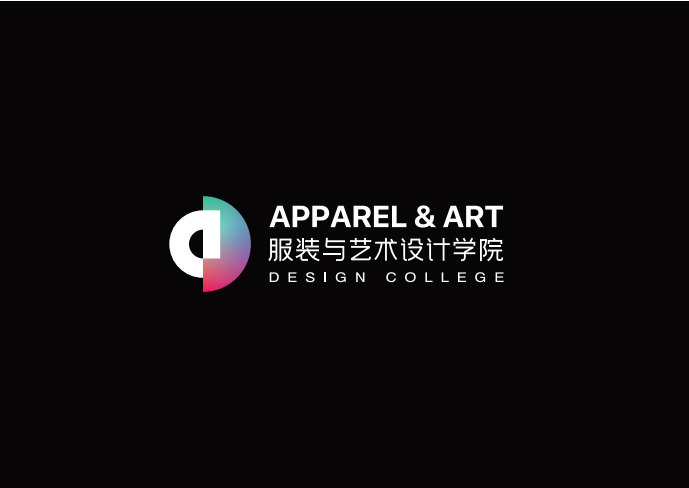 标志的创意灵感来源于服装学院“艺工融合”的办学理念和学科特色,在设计中通过视觉图形语言寻求艺术与工科交融共生的美感。同时体现文化传承与科技创新的理念美学。标志的设计语言主要运用分别代表艺术设计的单词Design和代表工程的单词Apparel来创意,分别提炼了两个单词的首字母小写a和大写D,通过寻找字母之间的图形语言表达方式,将两个字母分别用不同的视觉特性表达出来,字母a从设计的角度上诠释的更有构成感,象征着工程类学科的严谨与理性,字母D斌予了 流动的色彩变化,突出了艺术设计类学科的时尚与前卫,两个字母构建成一个整体,伴随着色彩的不停律动与变幻,将文化传承与科技创新表达的淋漓尽致。
